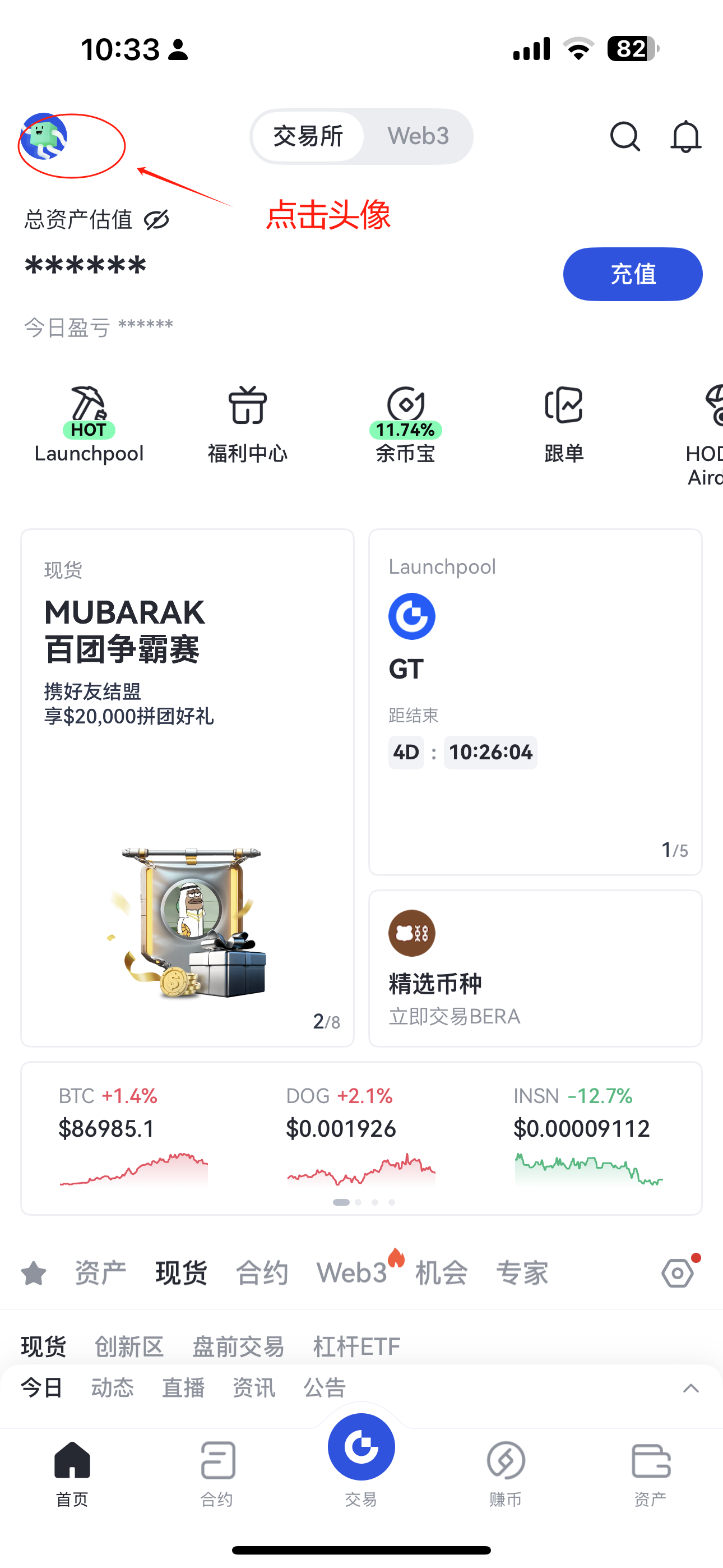1. 打开手机上的 ​**Gate.io App**，登录你的账户。